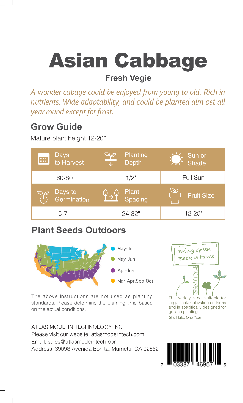 Grow fresh, crisp Asian Napa cabbage right in your own backyard garden. Atlas Emerald Crunch produces tender, sweet leaves with a refreshing crunch that are perfect for salads, stir-fry, soups, and homemade kimchi. This premium variety is specially selected for excellent flavor, strong growth, and high yields, making it a favorite for home gardeners across America.